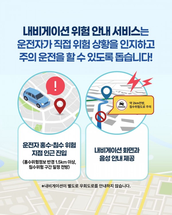 이번 서비스도 작년과 마찬가지로 운전자가 홍수·침수 위험 지점 인근(홍수위험정보 반경 1.5km 이상, 침수위험 구간 일정 전방)에 진입하면 내비게이션 화면과 음성