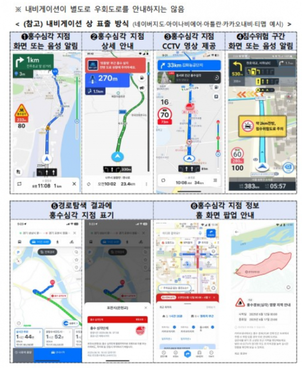 정부는 주요 내비게이션사*와 협력해 집중호우에 대비해 국민들의 도로 안전을 지키기 위해 내비게이션을 통한 홍수기 도로 위험 정보 제공