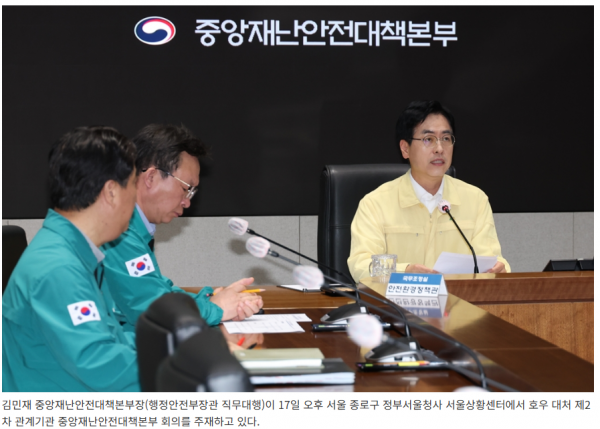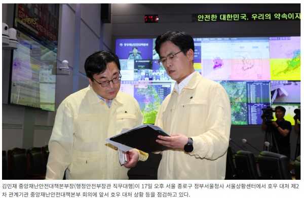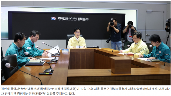 중앙재난안전대책본부(본부장: 김민재 행정안전부장관 직무대행)는 오늘(17일) 15시 30분, 집중호우 대응을 위한 중앙재난안전대책본부 회의를 개최했다.