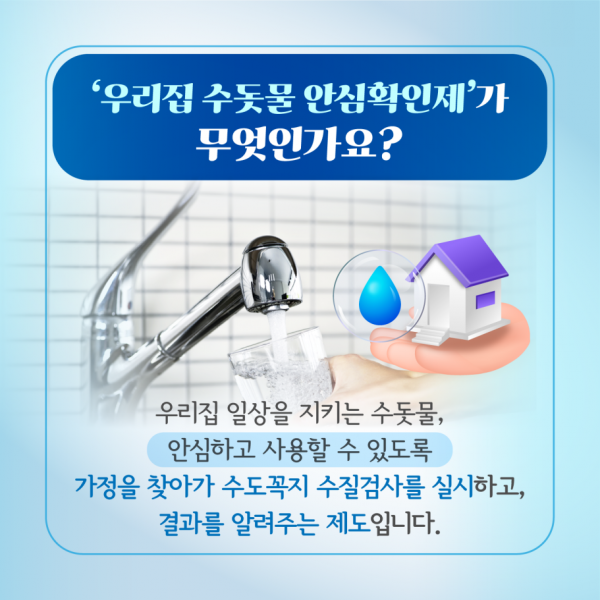 환경부는 수돗물 궁금증과 불안을 해소 하기 위하여 “수돗물 안심확인제”를 운영하고 있다.