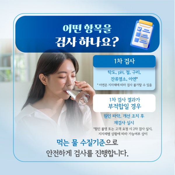 1차 검사는 탁도. PH, 철, 구리, 잔류염소, 아년 (아연은 지자체에 다라 검사불가할 수 있음) 1차 검사결과가 부적합일 경우 원인파악, 개선후 재검사까지 실시한다.