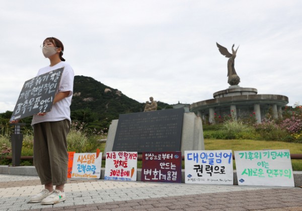 ▲청소년기후행동 활동가가 25일 오후 서울 종로구 청와대 분수대 앞에서 기후위기를 막을 현실적인 대책을 촉구하며 1인 시위를 하고 있다.