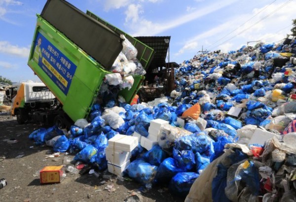추석연휴 직후인 지난달 23일, 광주시 한 재활용선별장. 수거차량이 명절용 스티로폼과 포장,비닐 등을 쏟아내고 있다. 코로나19 확산 이후 이와 같은 포장 폐기물은 증가 추세다.