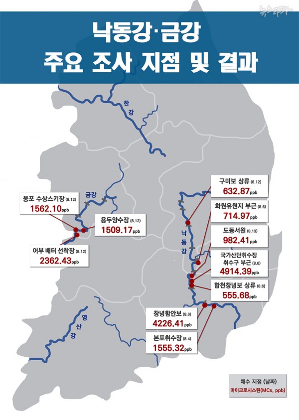 금강의 경우는 부여 웅포대교 수상스키를 타는 곳에서 마이크로시스틴이 리터 당 1562ppb, 익산 용두양수장에서 1509ppb가 나왔습니다. 이외에도 두 강의 여러 지점에서 수백 ppb 수준의 독성이 측정됐습니다.