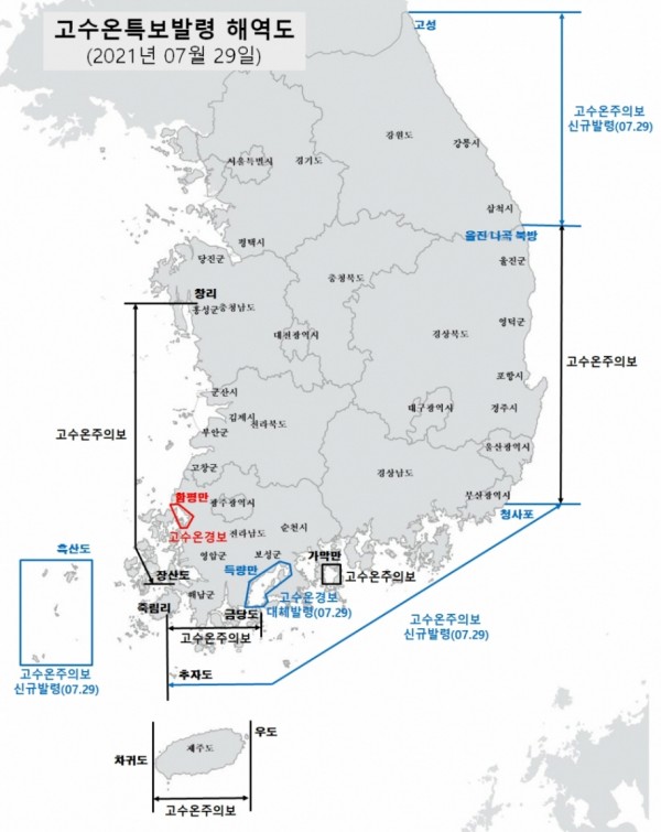 충남부터 강원까지 전 해역에 고수온특보 발령.