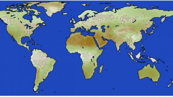 연구진은 위성사진을 이용해 위도 30~45도 범위의 지역에 걸친 장기 구름 덮개를 다양한 초목이 대기 경계와 상호작용하는 방식을 토대로 계산했다. 그들은 구름이 숲이 우거진 지역에 더 자주 형성되고 지구 대기에 더 큰 냉각 효과가 있다는 것을 발견했다. 이미지에서 검은 점은 숲이 우거진 지역을 나타내고 녹색 점은 초원과 다른 짧은 초목을 나타낸다.