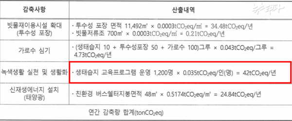 그러나 이같은 계산은 터무니없이 부풀려져 있다는 지적이다. 온실가스 감축효과를 분석하는 공식 기관인 한국환경공단 관계자는 "100명을 교육했을 때 100명 중에 한 명이 생활 습관을 변화했을 것이라고 가정을 하고 온실가스 감축량을 산정한 것이지 캠페인 한 번 했다고 해서 '온실가스가 감축된다'고 표현하진 않는다"고 말했다.