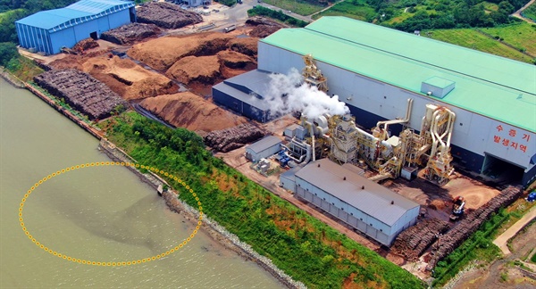 이곳에서 잘려나간 나무들은 어디로 갔을까? 나무가 사라진 곳을 찾아내면 왜 엉터리 벌목을 했는지 그 이유를 확인할 수 있을 것 같았다. 거제 석유기지 벌목 현장에서 1시간여 달려 경남 고성에 도착했다. '신영포르투'라는 공장 마당 곳곳에 벌목해온 나무들이 가득했다. 벌목해온 나무를 분쇄해 톱밥을 만들고 있었다.