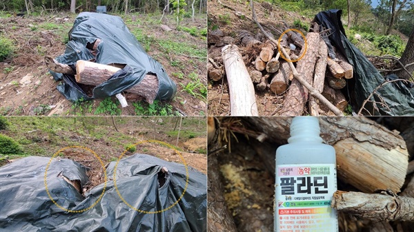 ▲ 공기 이동조차 막아야 할 훈증포가 찢어지고, 구멍 뚫리고, 벗겨져 있고, 독성 강한 약제까지 노출되어 있다. 재선충을 확산시키고 주변 생태계를 망가트리고 있는 현장이다.