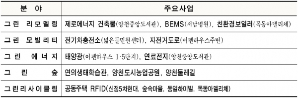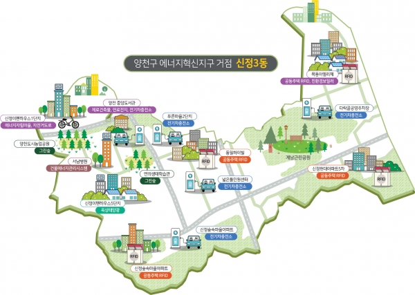 양천구는 서울시 2050 온실가스 감축 5대 분야 사업을 현재 두루 추진 중에 있다. 특히, 거점지역인 신정3동은 △제로에너지 건축물 △건물에너지관리시스템(BEMS) △전기차충전 자전거도로 △태양광 △양천도시농업공원 △공동주택 음식물종량제(RFID) 등 서울시의 2050 온실가스 감축 5대 분야 사업이 추진되고 있다. 신정3동은 인구밀도가 높고, 초중고·도서관·공원· 공동주택 등이 집중된 지역이다.