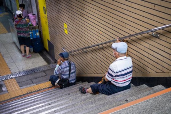 지난달 29일, 서울시 종로구 종로3가 지하철역 계단 위에 노인들이 한낮의 더위를 피하기 위해 앉아있다.