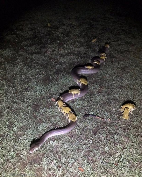 지난 2019년에는 10마리가 넘는 수수 두꺼비가 비단뱀 위에 올라탄 모습이 포착돼 화제가 되기도 했다. 당시 폭우로 근처 호수의 물이 불어나면서 수수 두꺼비가 물을 피하고자 비단뱀을 일종의 이동수단으로 이용한 것이다.