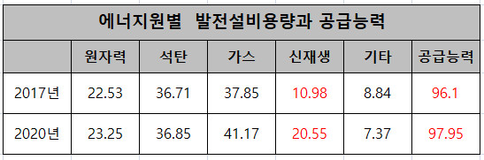 전체 발전원 설비 총용량은 신재생에너지의 대폭 증가에 힘입어 2017년 116.91GW에서 2020년 129.19GW로 12.3GW 늘어났지만, 공급능력은 96.1GW에서 97.95GW로 1.85GW 증가하는데 그쳤다.