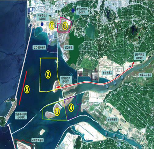 ▲새만금 재생에너지 발전사업 현황. 수상태양광 1단계 사업은 조감도상 2번에 조성된다. 새만금개발청.