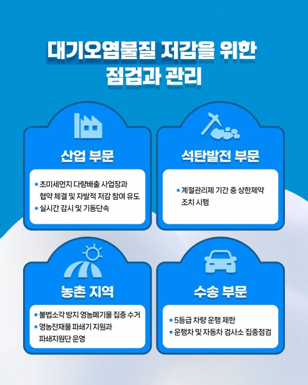 정부는 국민건강 보호를 최우선 과제로 삼고, 관계 부처 및 지자체, 민간과 협력하여 ‘제6차 미세먼지 계절관리제’와 ‘봄철 초미세먼지 총력대응(2.27.∼3.31.)’을