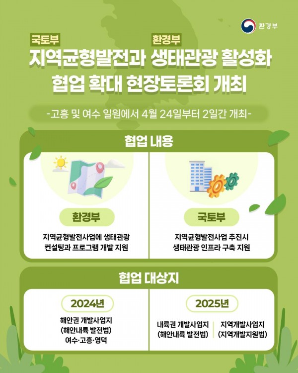 환경부(장관 김완섭)와 국토교통부(장관 박상우)는 ‘국토-환경 정책협의회*’ 1차 회의를 4월 24일부터 이틀간 전남 고흥 및 여수 일원에서 개최한다고 밝혔다.