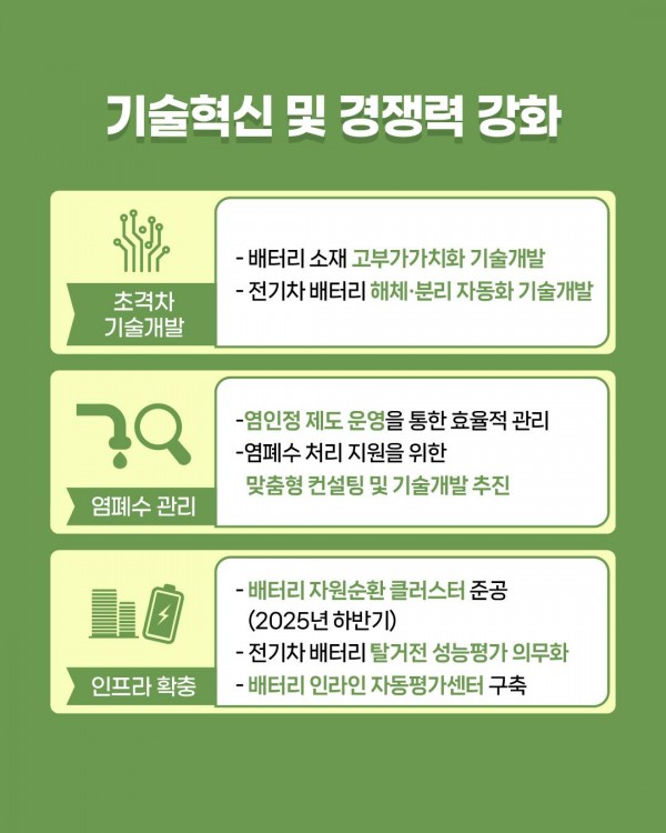 이번 대책은 전기차 등 모빌리티의 전동화와 재생에너지 전환으로 사용 후 배터리가 대량으로 발생될 것으로 예상됨에 따라 이를 고부가가치 자원으로 순환이용하여