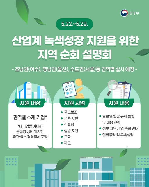 정부는 5월 22일부터 29일까지 총 3회에 걸쳐 관계부처(환경부, 산업통상자원부, 중소벤처기업부) 및 유관기관 합동으로 각 부처의 산업계 녹색성장 지원사업을 안내하는