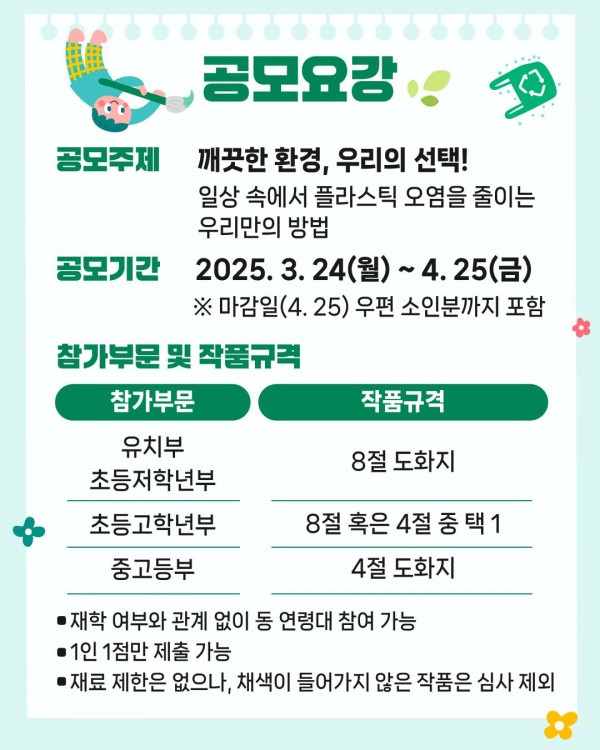 이번 미술 공모전은 28년 만에 국내(제주도)*에서 열리는 ‘2025년 세계 환경의 날’을 기념하고 미래 세대 주역인 어린이와 청소년들의 관심을 높이기 위해 마련됐다.