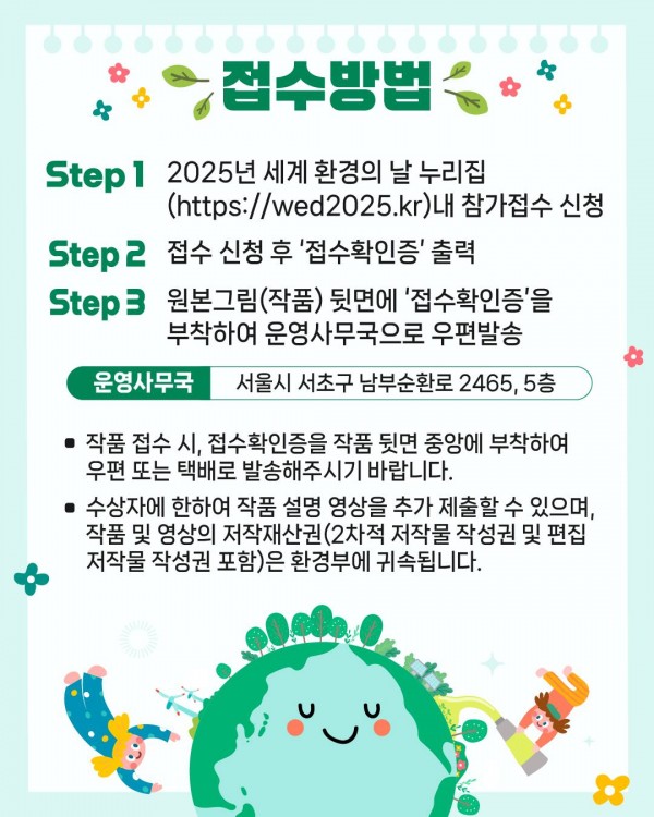 * 접수처 : 서울특별시 서초구 2465, 5층(2025 세계 환경의 날 미술 공모전 운영사무국), 문의 전화번호 : 02-6918-2506