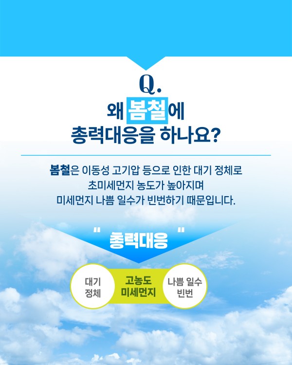 국민들의 야외 활동이 증가하며, 건설공사(비산먼지) 확대, 영농 준비(불법 소각)로 인한 대기오염 증가 요인 등에 따라 계절관리제
