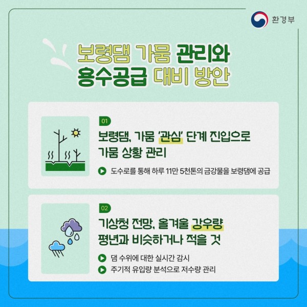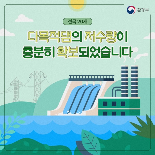 환경부는 댐 수위에 대한 실시간 감시 및 주기적 유입량 분석 등 철저한 저수량 관리로 용수공급에 차질이 없도록 대비하고 있다.
