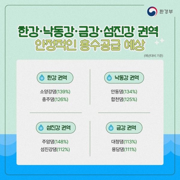 또한, 2022~2023년 극심한 가뭄이 발생했던 섬진강 권역의 주암댐(예년의 148%)과 섬진강댐(예년의 112%)도 예년보다 많은 저수량을 확보하고 있으며,