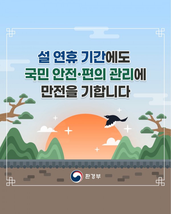 환경부(장관 김완섭)는 국민들이 다가오는 설 연휴를 안전하고 편안하게 보낼 수 있도록 환경안전 관리를 강화하고, 다양한 편의 제공을 확대한다고 밝혔다.