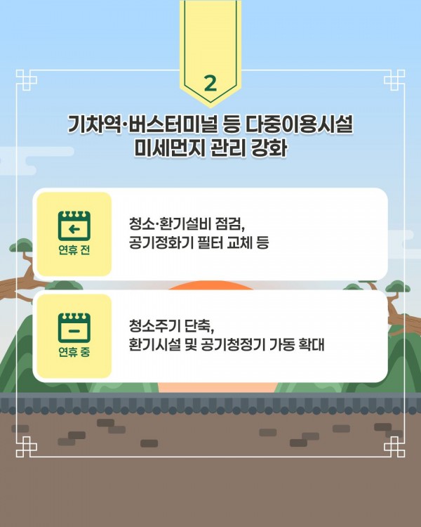 연휴 기간 중에는 청소주기 단축, 환기시설 및 공기청정기 가동을 확대하는 등 실내공기질을 철저히 관리할 예정이다.