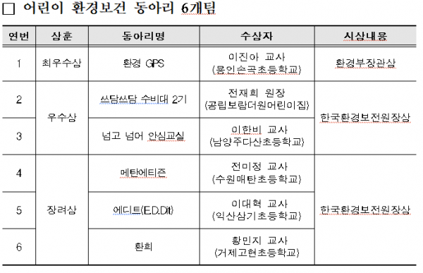 최우수상은 용인손곡초등학교의 ‘환경 지피에스(GPS)’가 받는다. 우수상 2개 팀은 공립보람더원어린이집의 ‘쓰담쓰담 수비대 2기’와