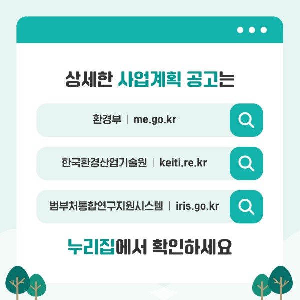 상세한 사업계획 공고는 환경부(me.go.kr) 및 한국환경산업기술원(keiti.re.kr), 범부처통합연구지원시스템(iris.go.kr) 누리집에서 확인할 수 있다.