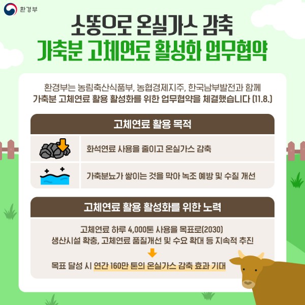 이병화 환경부 차관은 “이번 업무협약을 통해 그간 녹조 발생의 주요 원인으로 간주되었던 소똥으로 석탄 등을 대체할 수 있는 연료를 생산하면서