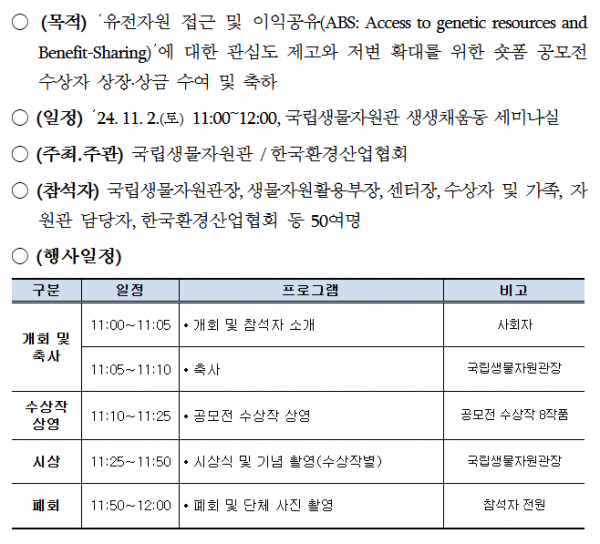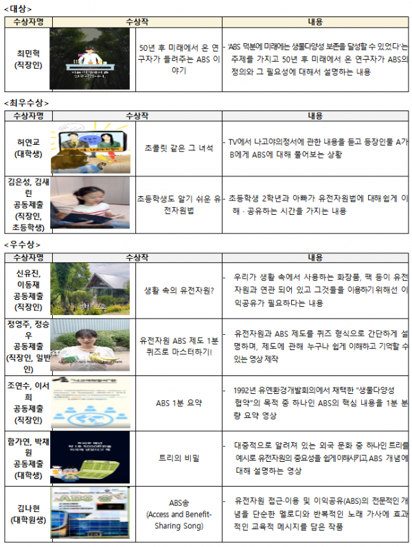 서민환 국립생물자원관장은 "이번 공모전으로 ‘유전자원 접근 및 이익공유(ABS)’ 제도의 인식 확산을 위한 우리 국민의 참신한 아이디어를