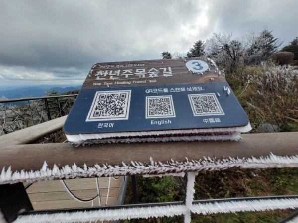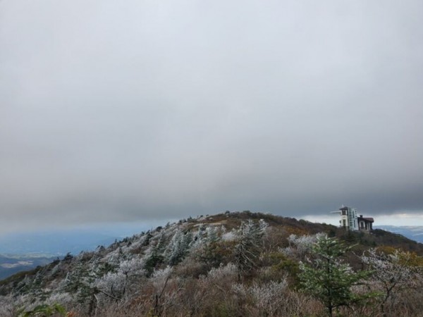 이날 오후 뚝 떨어진 기온과 강한 찬바람으로 만들어진 상고대는 마치 하얀 눈꽃이 피어난 모습으로, 가을 속 겨울풍경을 연출했다.