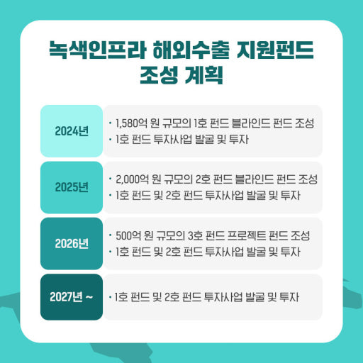 올해 6월 30일에 2,592억 원 규모(정부 출자 1,500억 원, 민간 투자 1,092억 원)의 ‘녹색인프라 해외수출 지원펀드’ 2호의 조성을 완료했다.