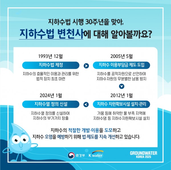 올해 행사는 그간 지하수 관리 제도의 발자취를 되짚고 향후 지하수 정책의 방향성을 모색하는 자리로, 지하수 분야의 학계 및 산업계 전문가,