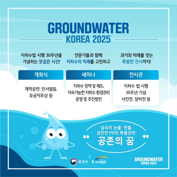 또한, 지하수 역사 사진전, 대국민 사진 공모전, 지하수 정책 홍보관, 지하수 장비 전시 등을 통해 지하수 가치 홍보와 산업 활성화를 위한 정보 교류의 장도 마련된다.