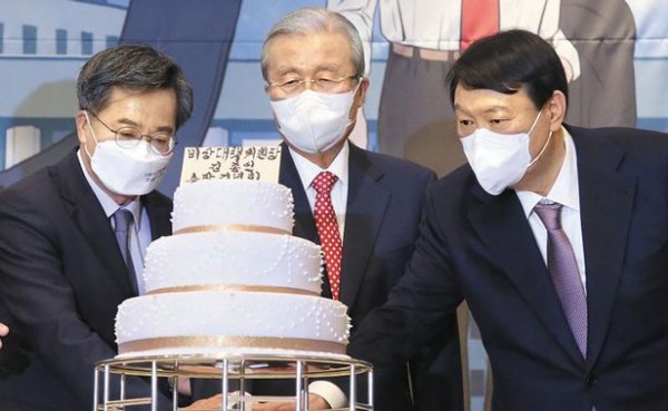 김종인 출판기념회 참석한 윤석열·김동연 - 국민의힘 윤석열(맨 오른쪽) 대선 후보가 15일 서울 용산의 한 호텔에서 열린 김종인(가운데) 전 비상대책위원장 출판기념회에서 케이크를 자르고 있다. 윤 후보는“김 전 위원장이 국가 대개조가 필요한 시점에 역할을 하셔야 될 때”라고 했다. 왼쪽은 김동연 전 부총리. /국회사진기자단