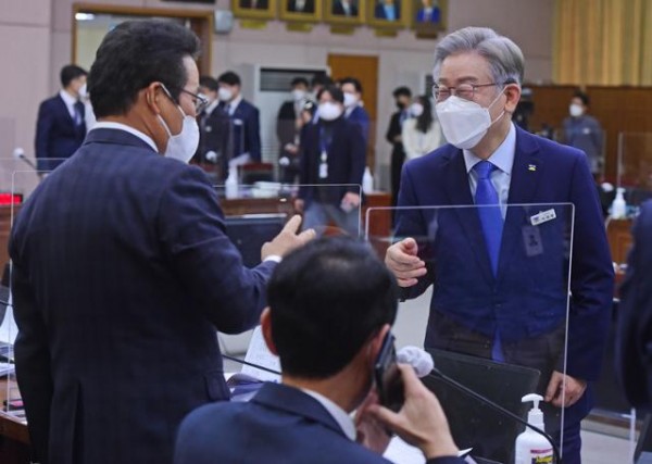 더불어민주당 대선후보인 이재명(오른쪽) 경기지사가 18일 경기 수원시 경기도청에서 열린 국회 행정안전위원회의 경기도 국정감사에서 김용판 국민의힘 의원과 인사하고 있다. 국회사진기자단