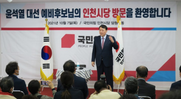 국민의힘 대선 경선 후보를 4명으로 압축하는 2차 예비경선(컷오프) 결과를 하루 앞둔 7일 윤석열 전 검찰총장은 인천으로 향했다. 수도권 표심을 확실히 잡겠다는 의지다. 윤 전 총장은 대장동 개발사업 특혜 의혹을 언급하며 민주당 정권의 부패를 비판했고, 국민의힘 내부를 겨냥해서도 쓴소리를 아끼지 않았다.