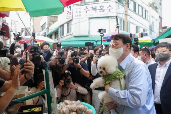 국민의힘 대선 예비후보인 윤석열 전 검찰총장이 7일 인천 부평 ‘부평문화의 거리’를 방문해 상인의 반려견을 안고있다. ⓒ윤석열 캠프