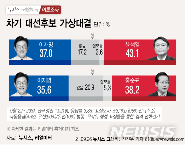 윤석열-이재명 격차는 6.1%p(오차범위 ±3.1%포인트), 홍준표-이재명 격차는 2.6%p차로 이 지사와의 경쟁력에선 윤 전 총장이 홍 의원보다 조금 우세했다.