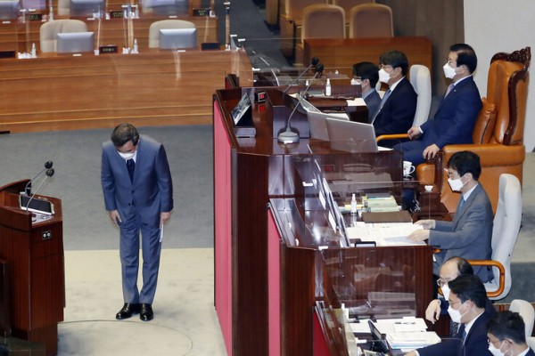 더불어민주당 이낙연 의원이 15일 서울 여의도 국회 본회의에서 자신의 사직안 표결에 앞서 의원들에게 인사하고 있다.