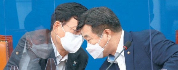 송영길-윤호중 귀엣말 더불어민주당 송영길 대표(왼쪽)와 윤호중 원내대표가 27일 당 최고위원회의에서 귓속말로 대화를 나누고 있다. 민주당 지도부가 언론중재법 개정안을 30일 본회의에서 처리하겠다는 방침을 고수하기로 한 가운데 당내 소신파 의원 등을 중심으로 반대 목소리가 커지고 있다. 사진공동취재단