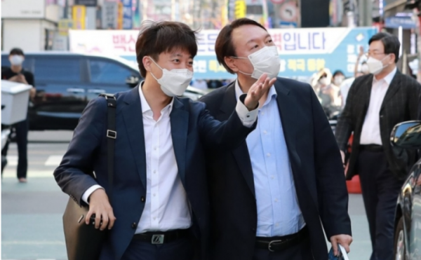 ↑ 국민의힘 이준석 대표와 윤석열 전 검찰총장이 25일 오후 서울 광진구 건대 맛의거리에서 '치맥회동'을 하기 위해 음식점으로 향하고 있다