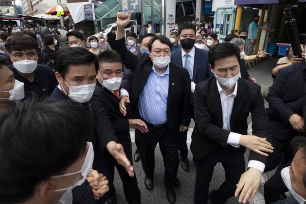 윤석열 전 검찰총장이 20일 오후 대구 중구 서문시장을 찾아 상인회 관계자들과의 간담회를 마친 후 서문시장을 나서며 “윤석열 대통령!”을 외치는 지지자들에게 손을 들어 답을 하고 있다.