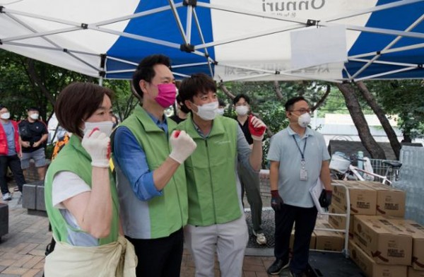 이 대표는 4일 서울 용산구 동자동 쪽방촌에서 경선주자인 김태호·안상수·원희룡·윤희숙·장기표·장성민·하태경·황교안 후보 등 8명과 함께 주민들에게 물과 삼계탕을 나눠주는 봉사활동을 했다. 이 대표는 "경선 버스 출발을 봉사하는 자세로 시작한 것을 국민이 좋게 봐주시면 좋겠다"고 했다.
