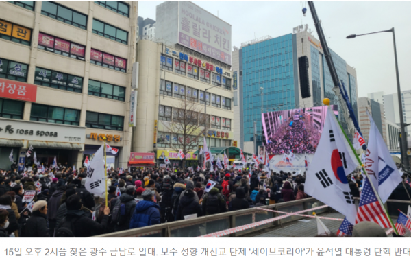 1980년 5·18 민주화운동이 일어났던 광주 금남로 일대에서 '12·3 비상계엄'으로 탄핵된 윤 대통령을 지지하는 대규모 집회가 15일 열렸다.