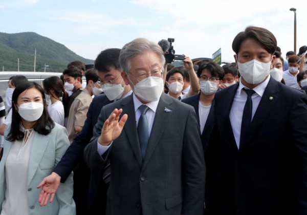 더불어민주당 대선 후보인 이재명 경기지사가 지난달 31일 부산 강서구 가덕도 신공항 예정지를 방문, 지지자들과 인사하면서 이동하고 있다. [캠프 제공]