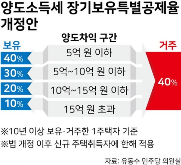 양도차익 규모와 상관없이 최대 40% 공제받을 수 있던 보유기간 공제율을 양도차익 △5억 원 이하는 40% △10억 원 이하 30% △15억 원 이하 20% △15억 원 초과 10%로 달리한 것도 핵심이다. 그간 집값 상승의 주범이 다주택자와 상승 기대심리라고 지목해 온 만큼 이들에 대한 혜택을 줄인 것이다.